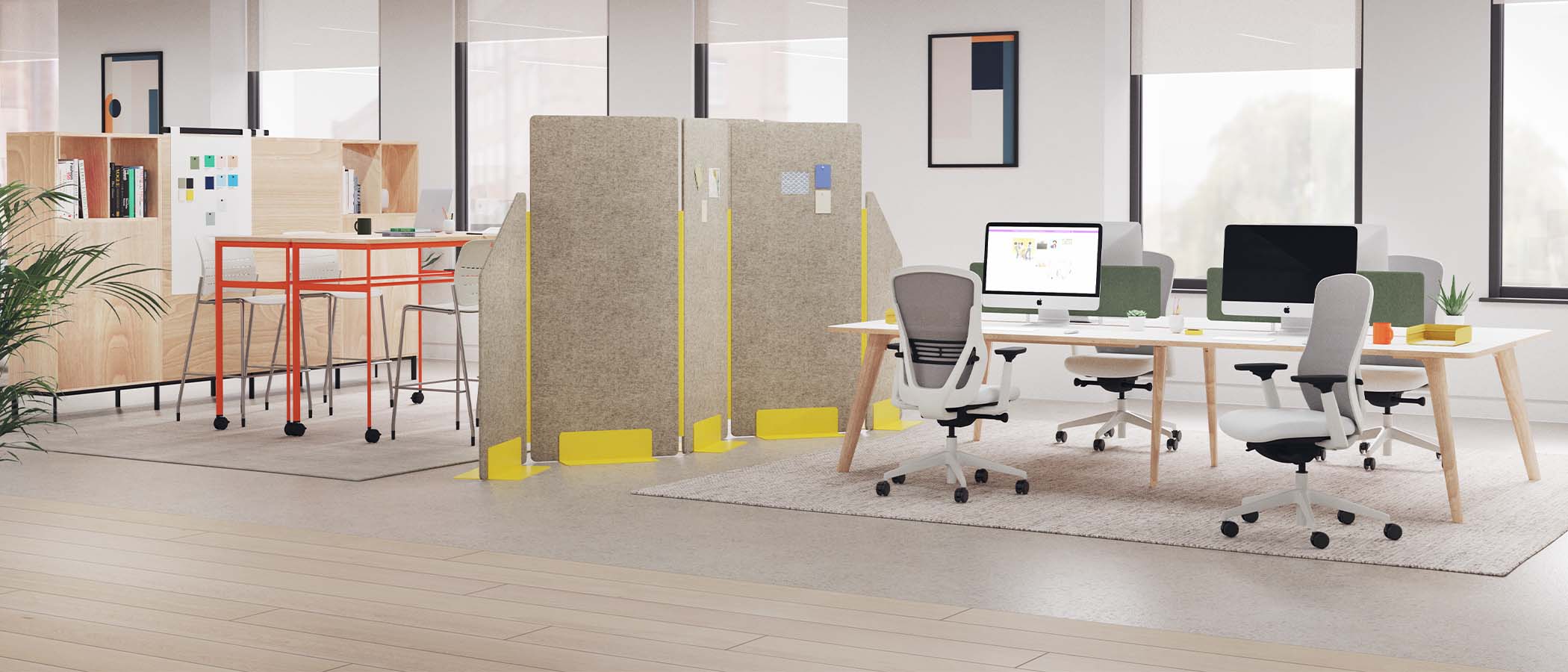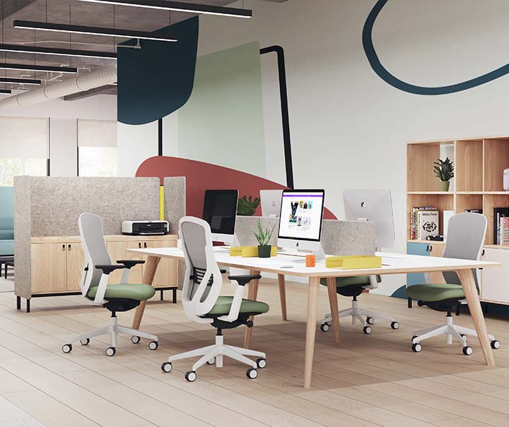 We can use those same simple actions to great affect within the workplace, we can create a series of settings built around freestanding structures, that give us the visual connection we still visually desire with others whilst signifying a new space.